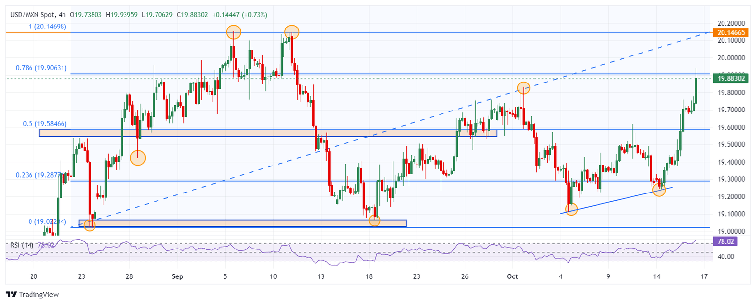 El USD/MXN estableció un mínimo de la sesión en 19.67, encontrando compradores agresivos que llevaron la paridad a máximos de 5 semanas en 19.74. Actualmente, el dólar estadounidense opera sobre 19.90 frente al Peso mexicano, ganando un 1.04% diario.