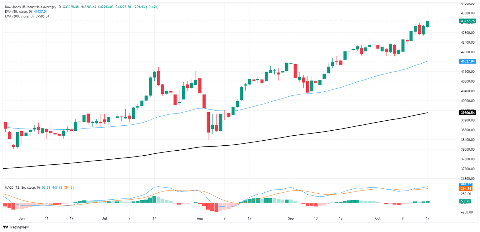El Dow Jones continúa obteniendo ganancias en el gráfico en el extremo superior, alcanzando nuevos máximos históricos por encima de 43.250 y extendiendo la carrera alcista de 2024 a casi un 15%. El impulso alcista una vez más está superando los promedios a largo plazo, con la media móvil exponencial (EMA) de 200 días subiendo a través de 39.500 y luchando por ponerse al día.