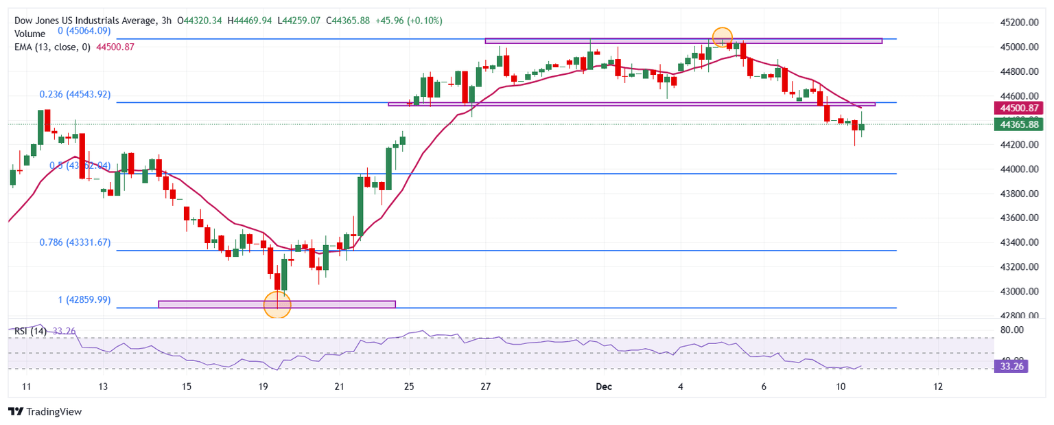 El Dow Jones reaccionó a la baja una resistencia de corto plazo dada por el máximo histórico alcanzado el 5 de diciembre en 45.058. El soporte más cercano se encuentra en 43.249, mínimo del 21 de noviembre, en convergencia con el retroceso al 78.6% de Fibonacci. El siguiente soporte clave está en 42.850, punto pivote del 19 de noviembre.
