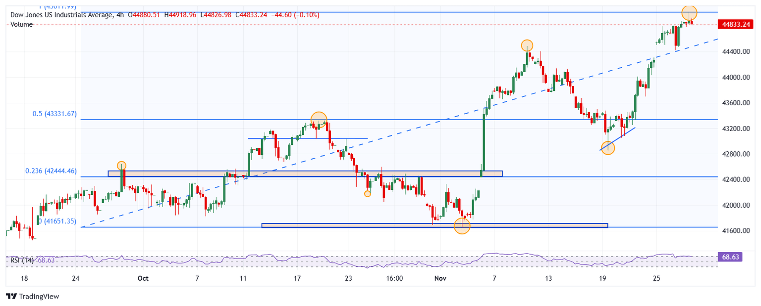 El Promedio Industrial Dow Jones cotiza en estos momentos en 44.895, subiendo un 0.14%, estableciendo un nuevo máximo histórico por tercera sesión consecutiva en 45.006.