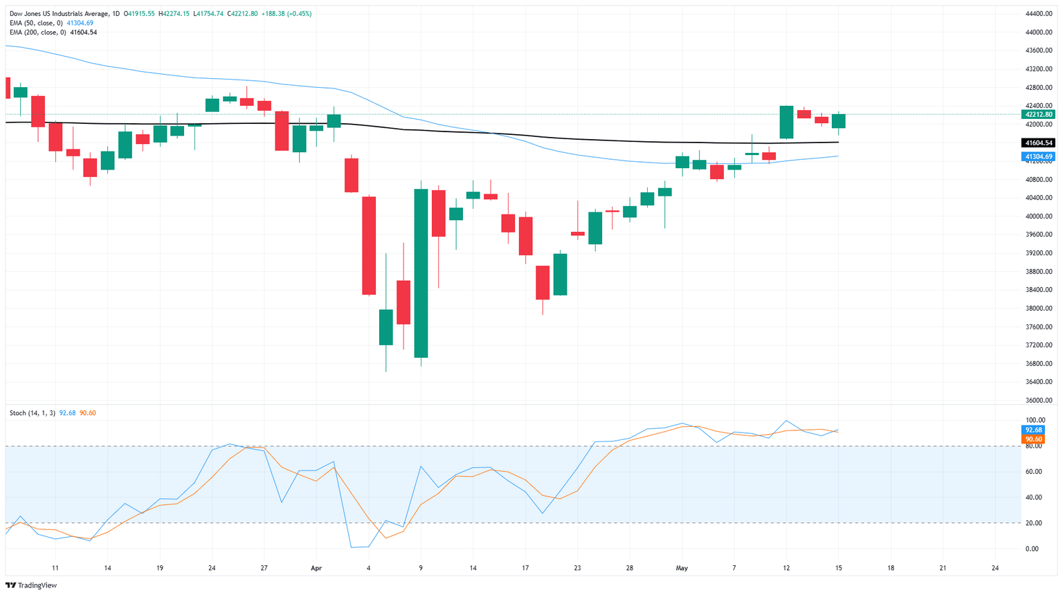 El Promedio Industrial Dow Jones ha recuperado la mayor parte de sus suaves pérdidas a mitad de semana, pero aún se mantiene por debajo del pico del lunes de 42,410. El impulso alcista ha logrado llevar al Dow Jones por encima de la Media Móvil Exponencial (EMA) de 200 días cerca de 41,600, al menos por ahora.
