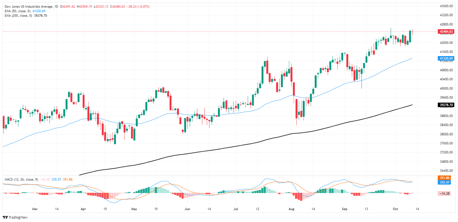 El Promedio Industrial Dow Jones (DJIA) recortó algunas de las ganancias anteriores de la semana después de que las cifras de inflación del Índice de Precios al Consumidor (IPC) de EE.UU. de septiembre no cumplieran con las expectativas del mercado. Las solicitudes iniciales de subsidio de desempleo en EE.UU. también se aceleraron a su cifra más alta semana a semana en más de un año, lo que indica que el mercado laboral, aunque aún relativamente saludable, todavía tiene margen para cierta flexibilidad en las cifras de empleo.