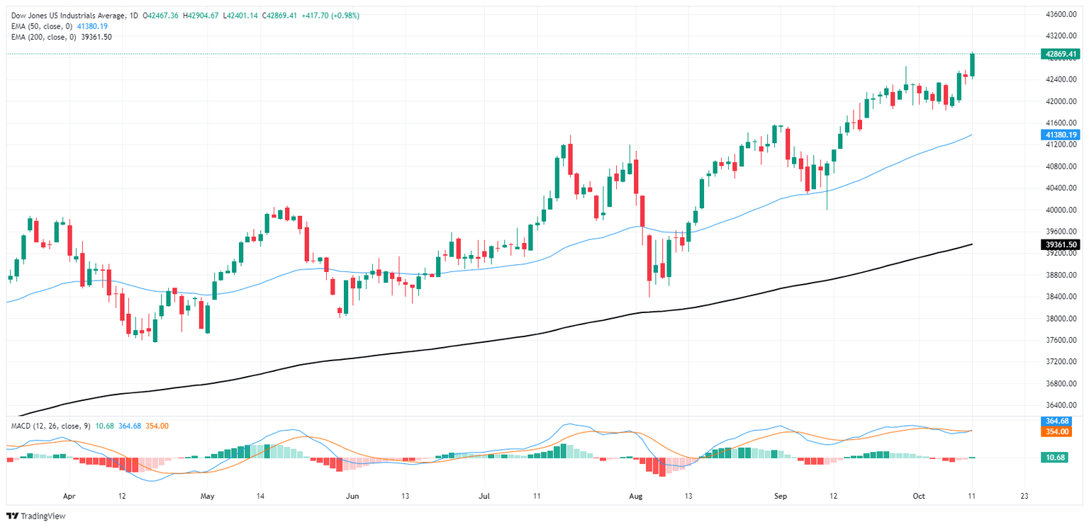 El Promedio Industrial Dow Jones (DJIA) subió más de 400 puntos de mínimo a máximo el viernes, impulsado a un nuevo récord de 42.837 después de que las cifras de inflación del Índice de Precios al Productor (IPP) de EE.UU. se enfriaran en septiembre. La inflación a nivel de productor más baja y las ganancias optimistas de los bancos elevaron las acciones en general, ya que el Dow Jones se dirige a su quinta semana consecutiva de ganancias.