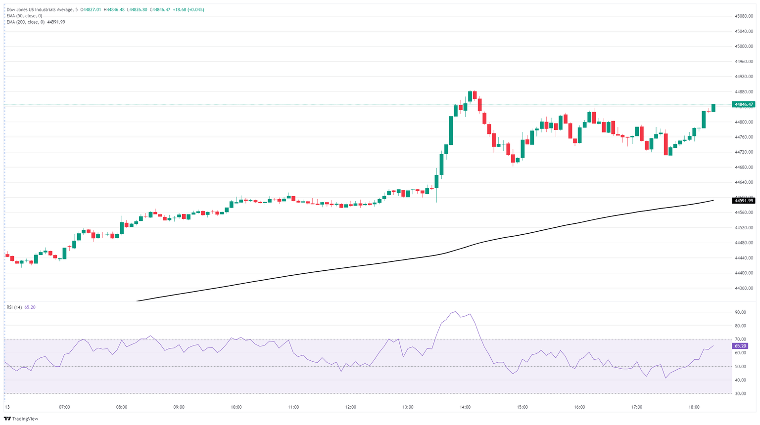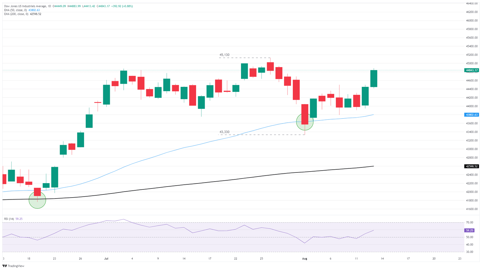 El Dow Jones fue empujado firmemente por encima del nivel de 44.500, y está de vuelta en camino de desafiar nuevamente la zona principal de 45.000. La acción del precio sigue estando en el lado bajo de los máximos históricos por encima de 45.130, con un impulso alcista que se ve impulsado por el soporte técnico de la media móvil exponencial (EMA) de 50 días cerca de 43.780.