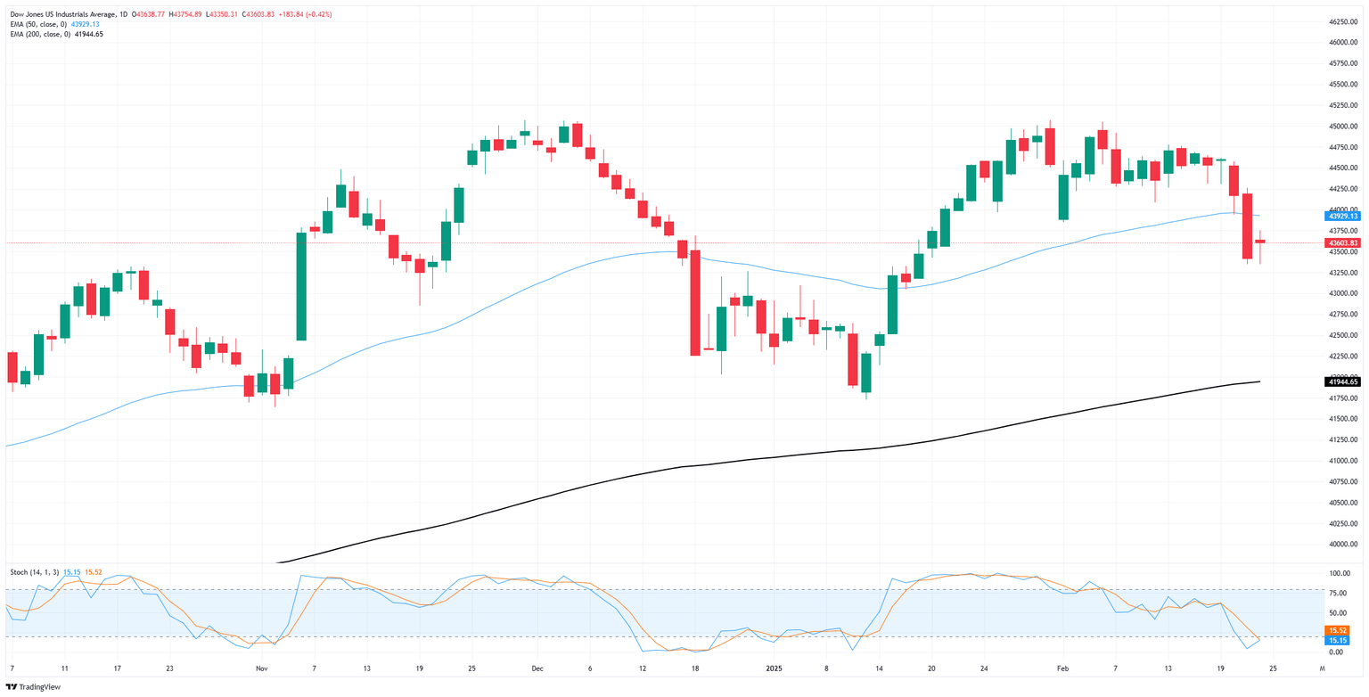 El Dow Jones perdió alrededor del 2.75% en una racha de pérdidas de dos días que llevó las ofertas de 44.575 a 43.345, pero se ven poco probables más pérdidas a la baja a medida que los mercados se recuperan de mínimos de cuatro semanas. La acción del precio sigue bien soportada por encima de la EMA de 200 días a largo plazo que se aproxima a 42.000.