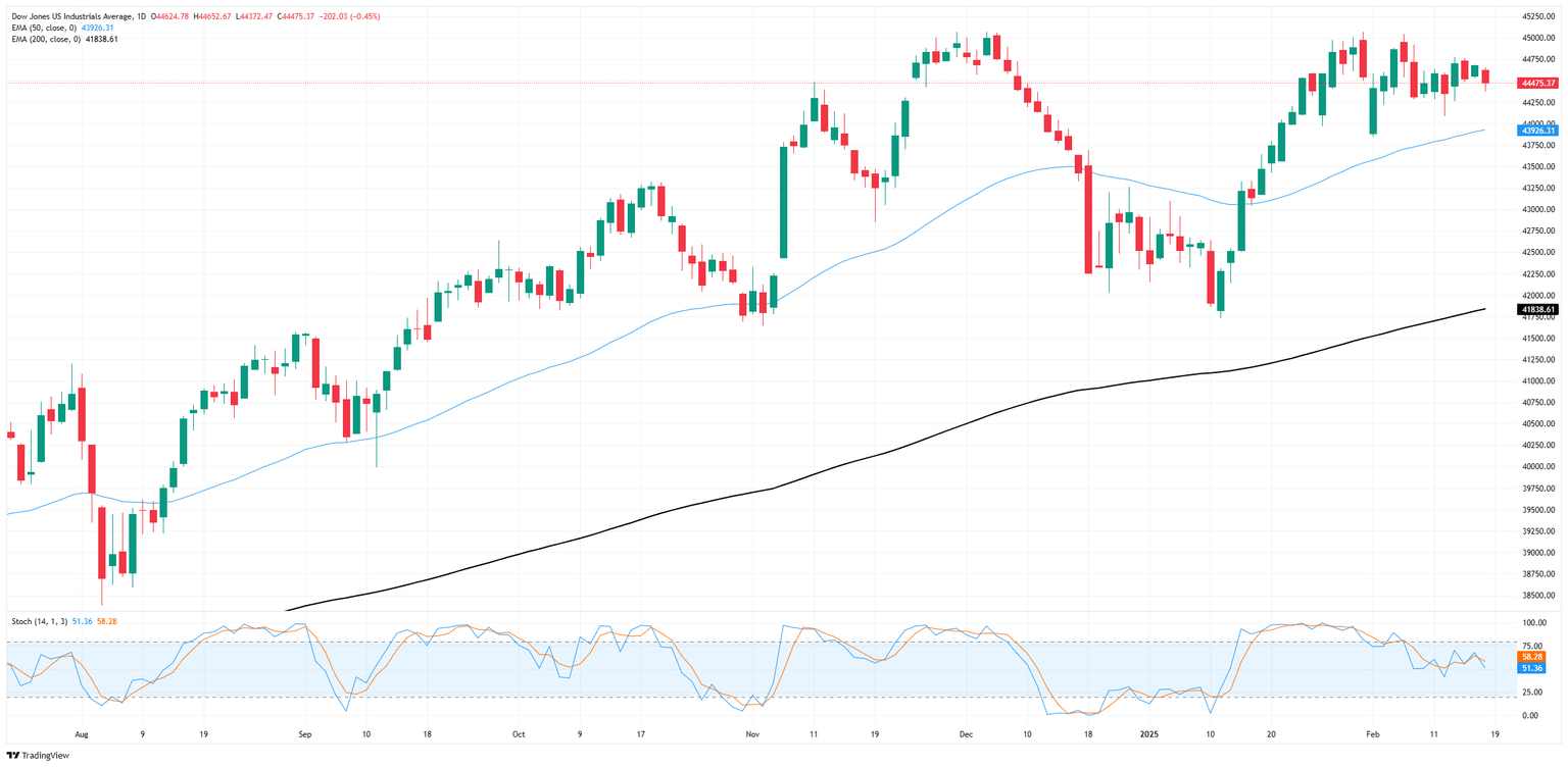 El Promedio Industrial Dow Jones (DJIA) tropezó al inicio del martes, cayendo alrededor de 300 puntos en su punto más bajo tras un largo fin de semana. Las acciones recuperaron algo de su posición durante la sesión del mercado estadounidense, pero el Dow Jones sigue bajando alrededor de 100 puntos cerca de 44.450. Los operadores de acciones regresaron a los mercados tras el festivo del Día del Presidente el lunes, apresurándose a valorar los titulares antes de darse cuenta de que no había mucho que valorar.