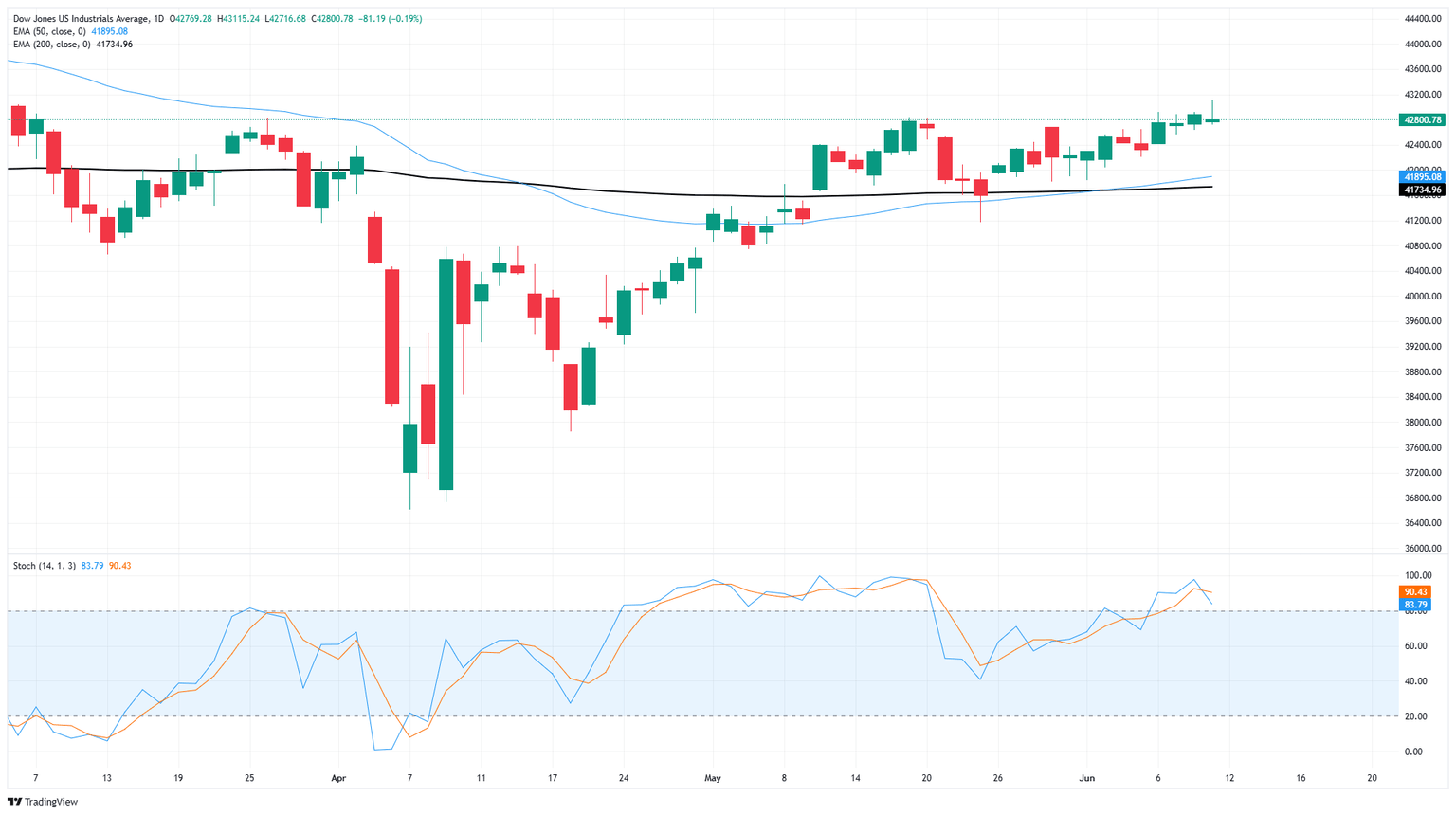 El Promedio Industrial Dow Jones finalmente ha superado el importante nivel de precio de 43.000 después de meses de estancamiento por aranceles. El sentimiento alcista de los inversores ha impulsado al Dow Jones a máximos de 14 semanas, y ha puesto al DJIA de nuevo en camino para intentar alcanzar nuevos máximos históricos por encima de 45.000.