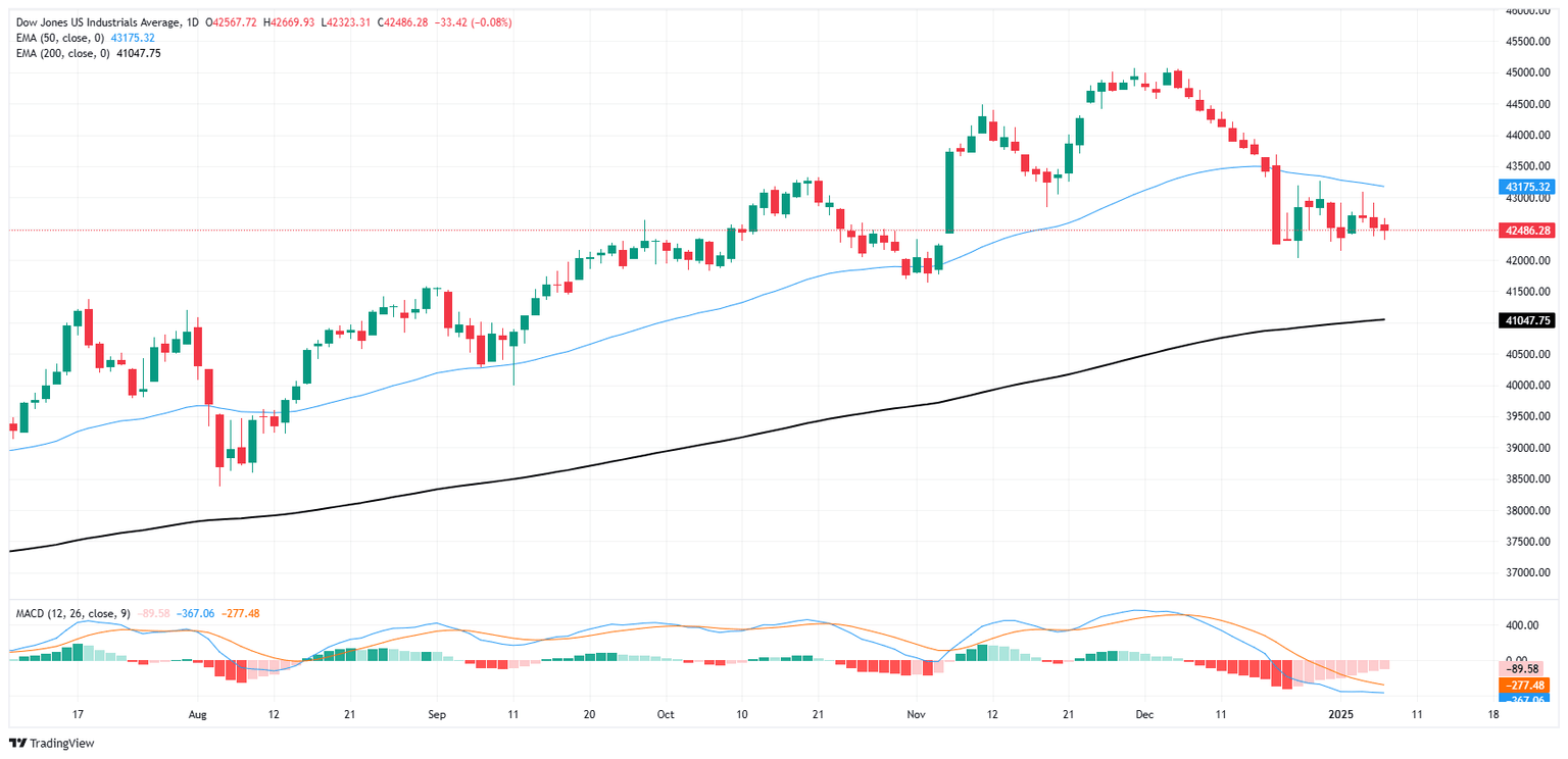A pesar de un giro bajista a corto plazo, el impulso a la baja aún enfrenta vientos en contra significativos. El DJIA sigue operando al norte de la media móvil exponencial (EMA) de 200 días cerca de 41.200, y los postores aún están tratando de encontrar su base y empujar la acción del precio por encima de la EMA de 50 días cerca de 43.150.