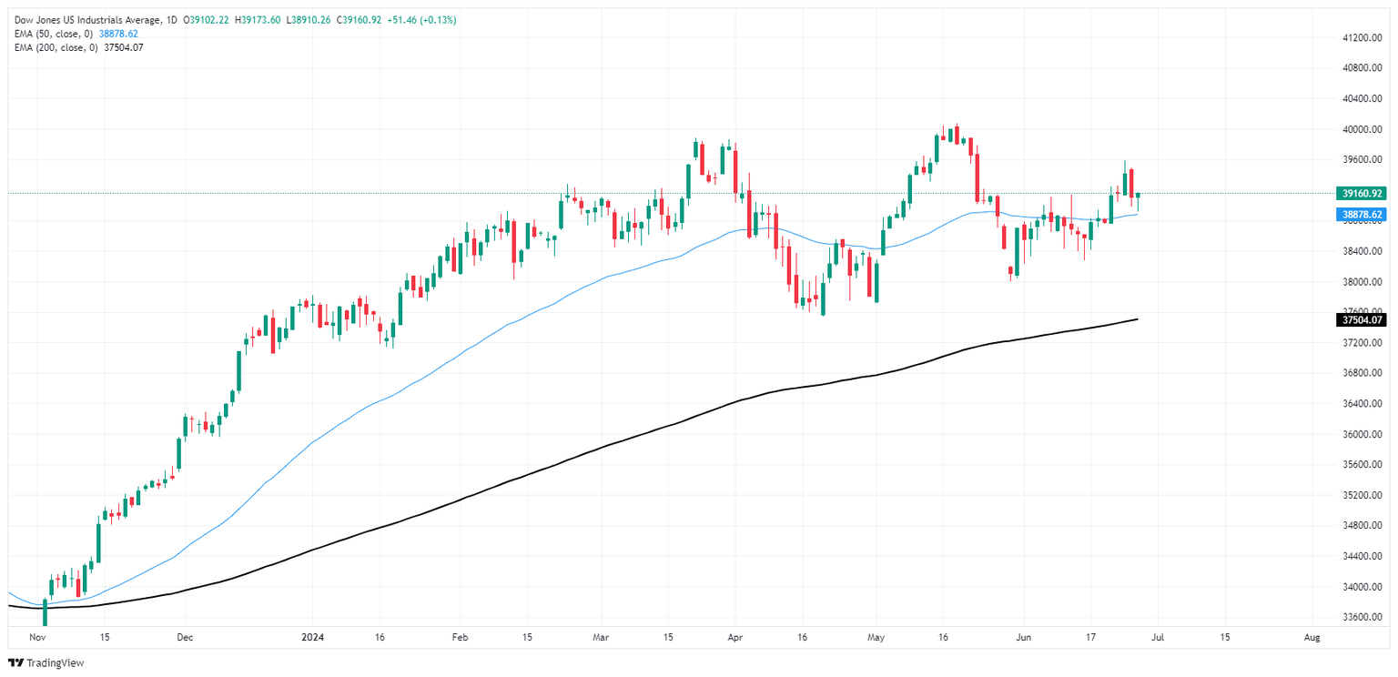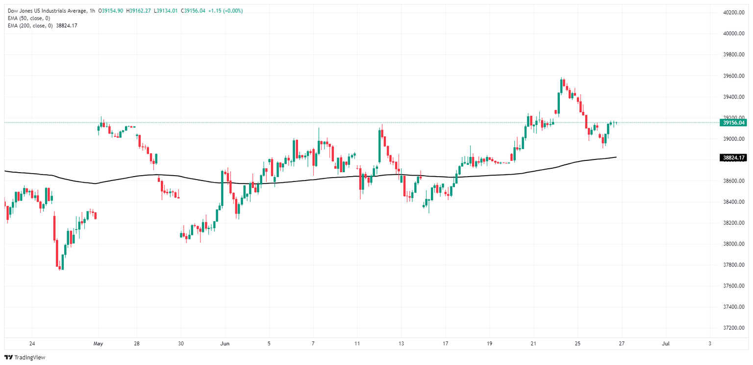 El Dow Jones se mantiene dentro del rango de toque de las ofertas de cierre del día anterior cerca de 39.100,00 el miércoles. El DJIA sigue por debajo del pico de la semana pasada cerca de 39.600,00, pero un suelo a corto plazo se ha fijado en los mínimos tempranos del miércoles justo por encima de 38.900,00.