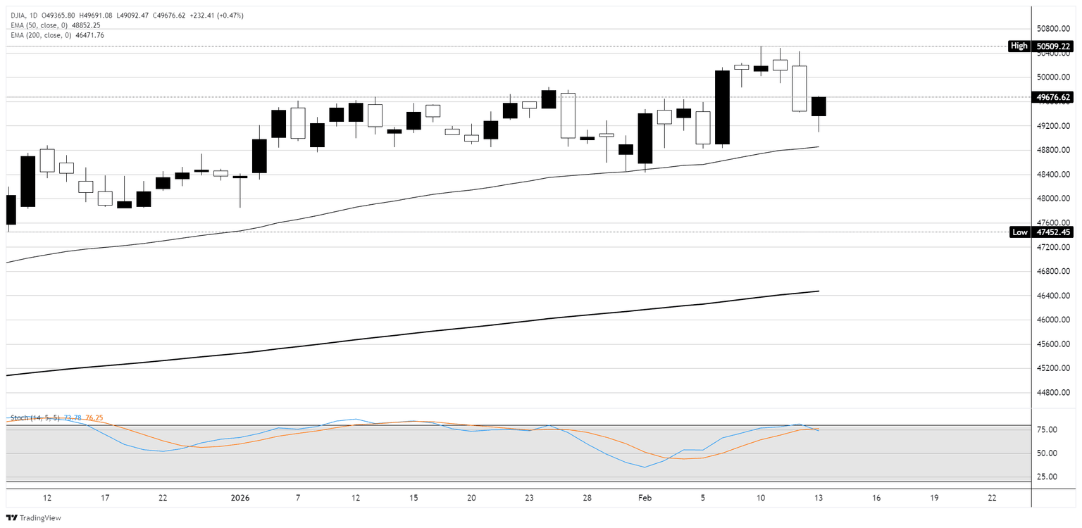 El DJIA abrió el viernes en 49.366 y alcanzó un máximo intradía de 49.670, negociándose cerca del nivel de 49.665 en la sesión de la tarde. El índice se mantiene muy por encima de su EMA de 50 días en 48.852 y su EMA de 200 días en 46.472. El oscilador estocástico (14,5,5) está leyendo 73.67/76.23, acercándose al territorio de sobrecompra cerca del nivel 75. La resistencia superior se sitúa en el reciente máximo de oscilación cerca de 50.509, mientras que el mínimo intradía del viernes de 49.092 marca un soporte inmediato. Un movimiento sostenido por encima del nivel psicológico de 50.000 señalaría que los toros han recuperado el control tras la volatilidad de esta semana, mientras que un fracaso en mantener el nivel de 49.000 abriría la puerta hacia la zona de 48.800-48.900.