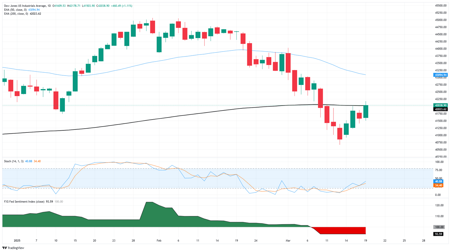 El Dow Jones volvió a superar la zona de 42.000 y el Standard and Poor’s 500 (S&P 500) subió alrededor del 1.5% a medida que las acciones se inclinaban de nuevo hacia el lado alcista tras la última decisión de tasas de la Fed. El presidente de la Fed, Jerome Powell, señaló que las proyecciones de crecimiento para 2025 se han visto significativamente obstaculizadas por la errática política de la administración Trump de anunciar aranceles comerciales en las redes sociales solo para luego retractarse. Como resultado, el Comité Federal de Mercado Abierto (FOMC) revisó su pronóstico de Producto Interno Bruto (PIB) para finales de 2025 a 1.7%, una fuerte caída desde la estimación del 2.1% compartida en diciembre.