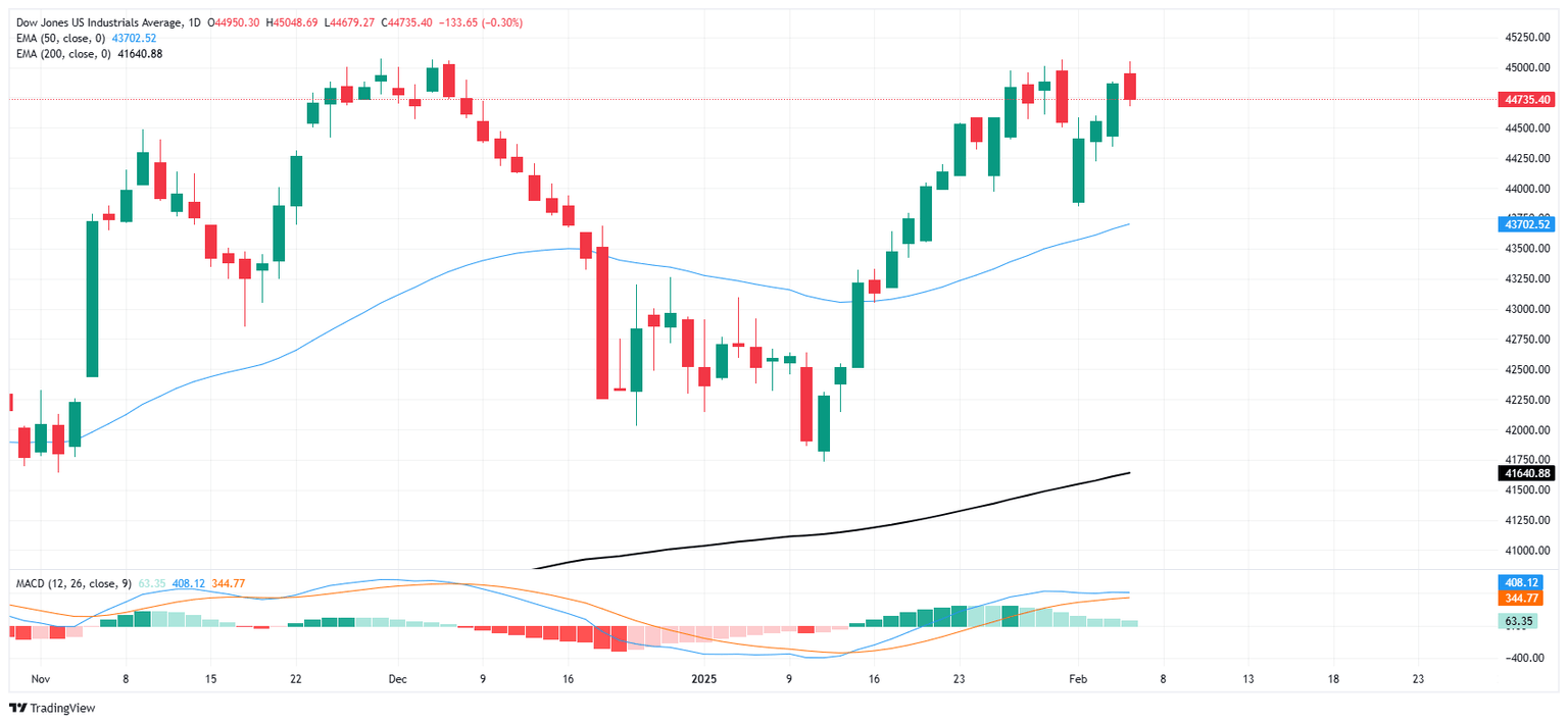 El Dow Jones está listo para romper una racha de tres días de ganancias ya que la zona de 45.000 resulta ser una superficie demasiado resbaladiza para que los alcistas obtengan un punto de apoyo. A pesar de una postura más suave el jueves, el Dow se mantiene obstinadamente en territorio alcista, en verde con un 5.2% hasta ahora en 2025.