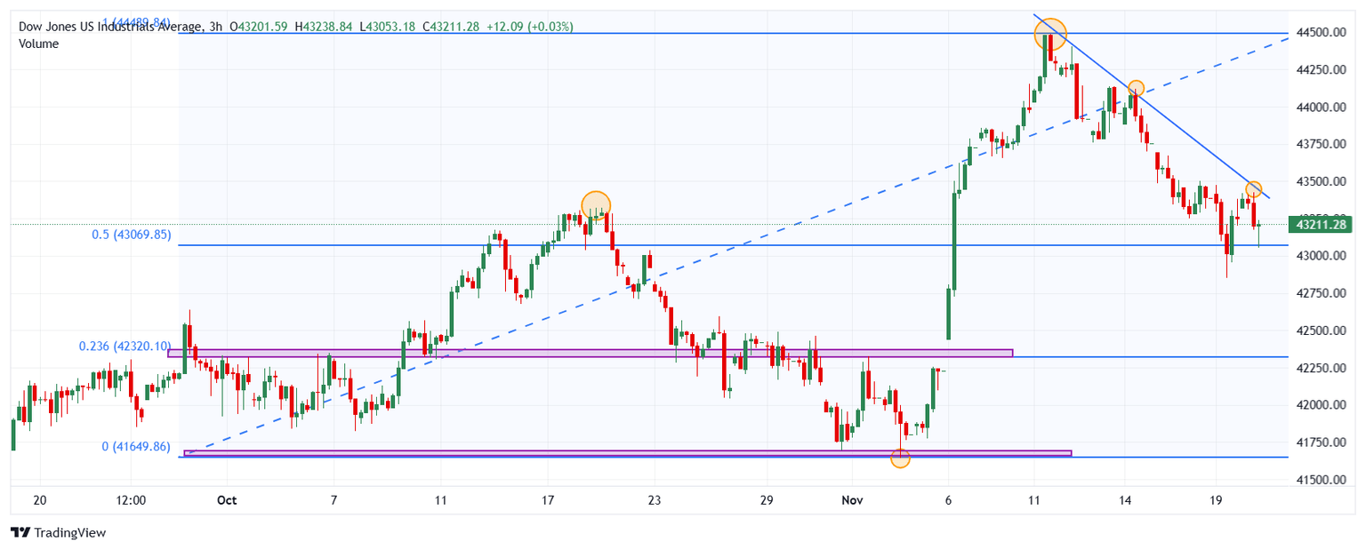 El Promedio Industrial Dow Jones cotiza sobre 43.076, con una pérdida diaria de un 0.13%, hilando su quinta sesión consecutiva a la baja.