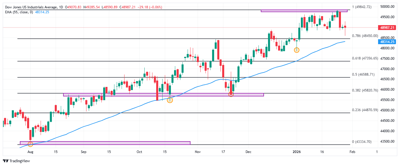 El Dow Jones retrocede 33 puntos, llegando a mínimos del 5 de enero en 48.590.
