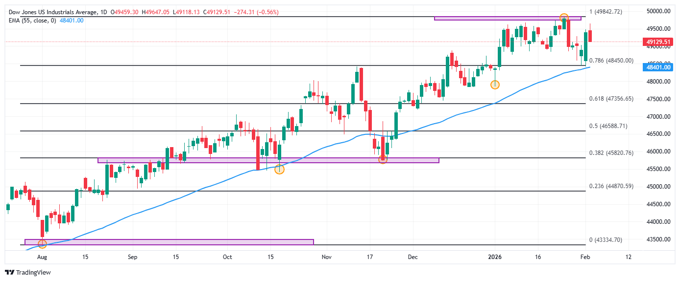 El Dow Jones reaccionó a la baja desde máximos del 27 de enero en 49.647, donde encontraron vendedores que arrastraron el índice a un mínimo del día en 49.118.