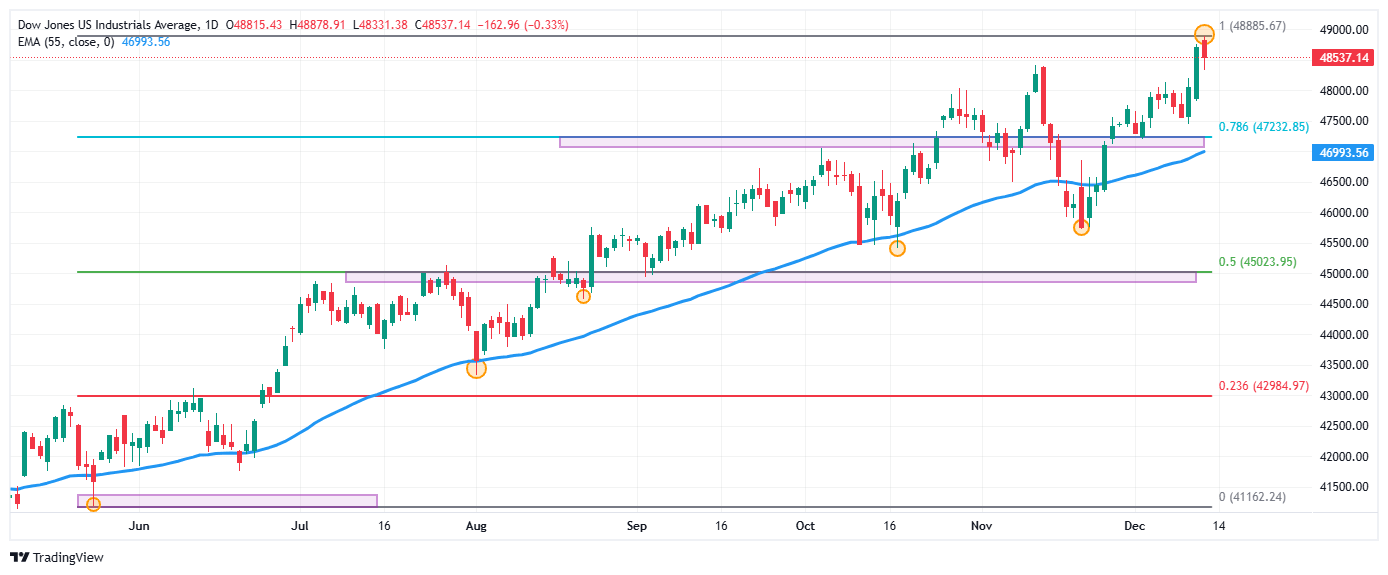 El Dow Jones reaccionó a la baja desde un nuevo máximo histórico en 48.878, encontrando vendedores que arrastraron la paridad a un mínimo diario en 48.331.