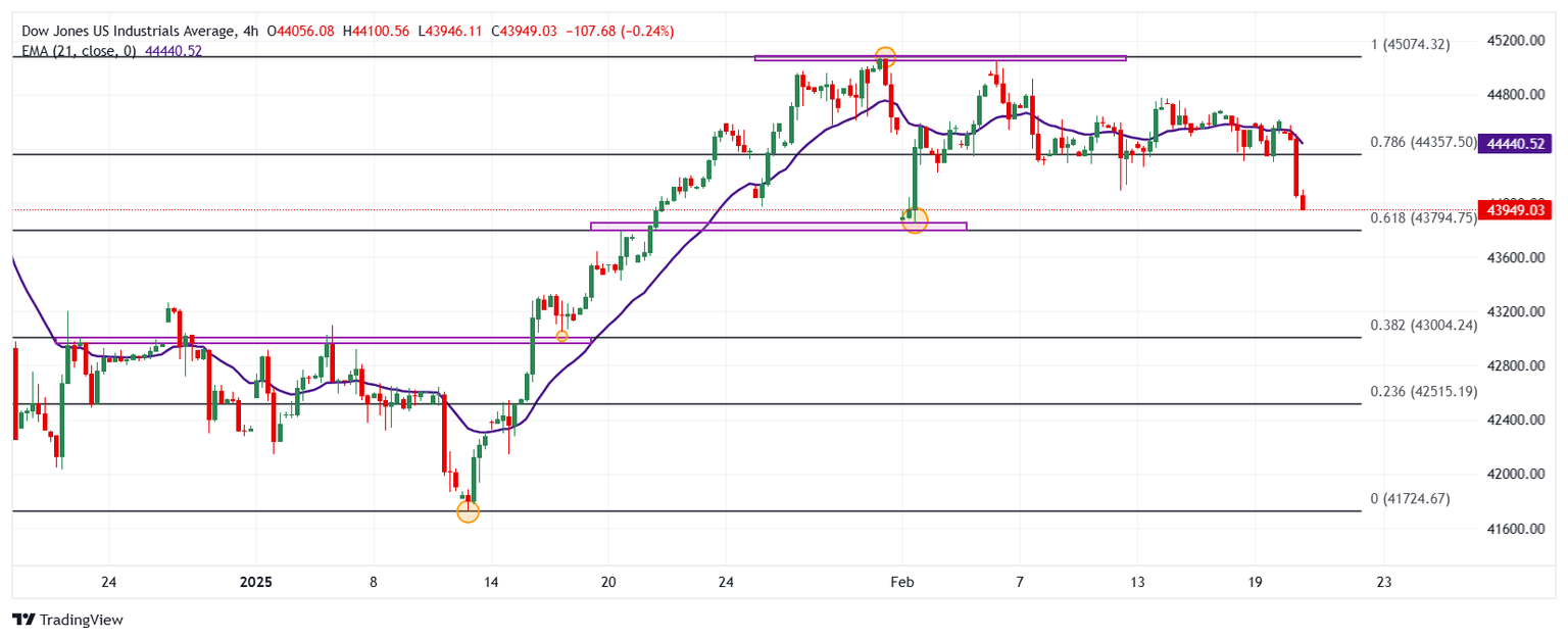 El índice Dow Jones pierde un 1.25% en la jornada del jueves, cotizando actualmente sobre 44.043, llegando a mínimos no vistos desde el 3 de febrero en 44.032.