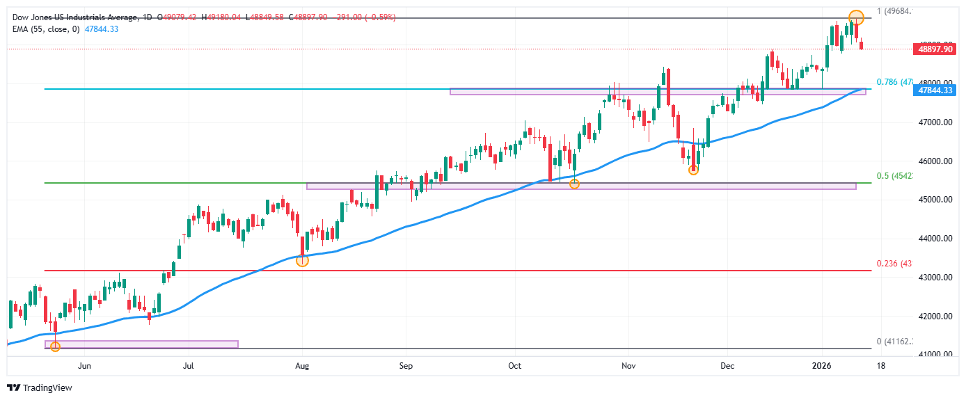 El índice Dow Jones cae un 0.53% el día de hoy, visitando mínimos del 8 de enero en 48.849.