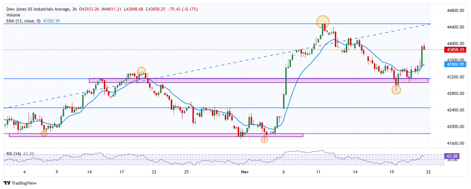 El Promedio Industrial Dow Jones se negocia en 43.946, con una ganancia diaria de un 1.30%, alcanzando un máximo no visto desde el 14 de noviembre y firmando su segunda sesión consecutiva al alza.