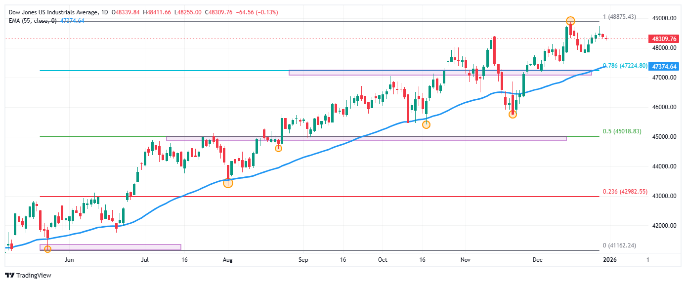 El índice Dow Jones presenta una caída de un 0.13% en el día, visitando mínimos del 23 de diciembre en 48.255.