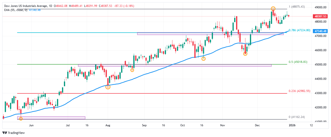 El índice Dow Jones cae un 0.23% diario, llegando a mínimos del 23 de diciembre en 48.291.