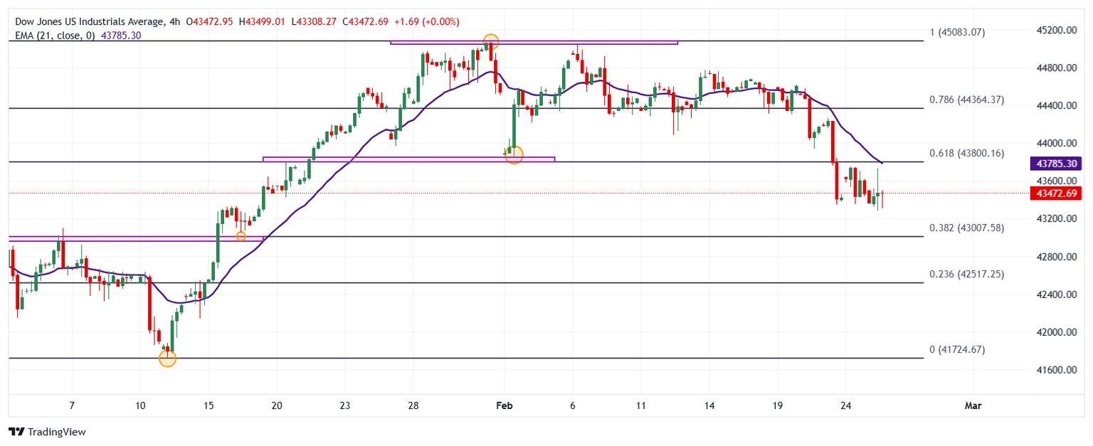 El Dow Jones marcó un máximo del día en 43.731, encontrando vendedores agresivos que arrastraron el índice a un mínimo no visto desde el 17 de enero en 43.285.