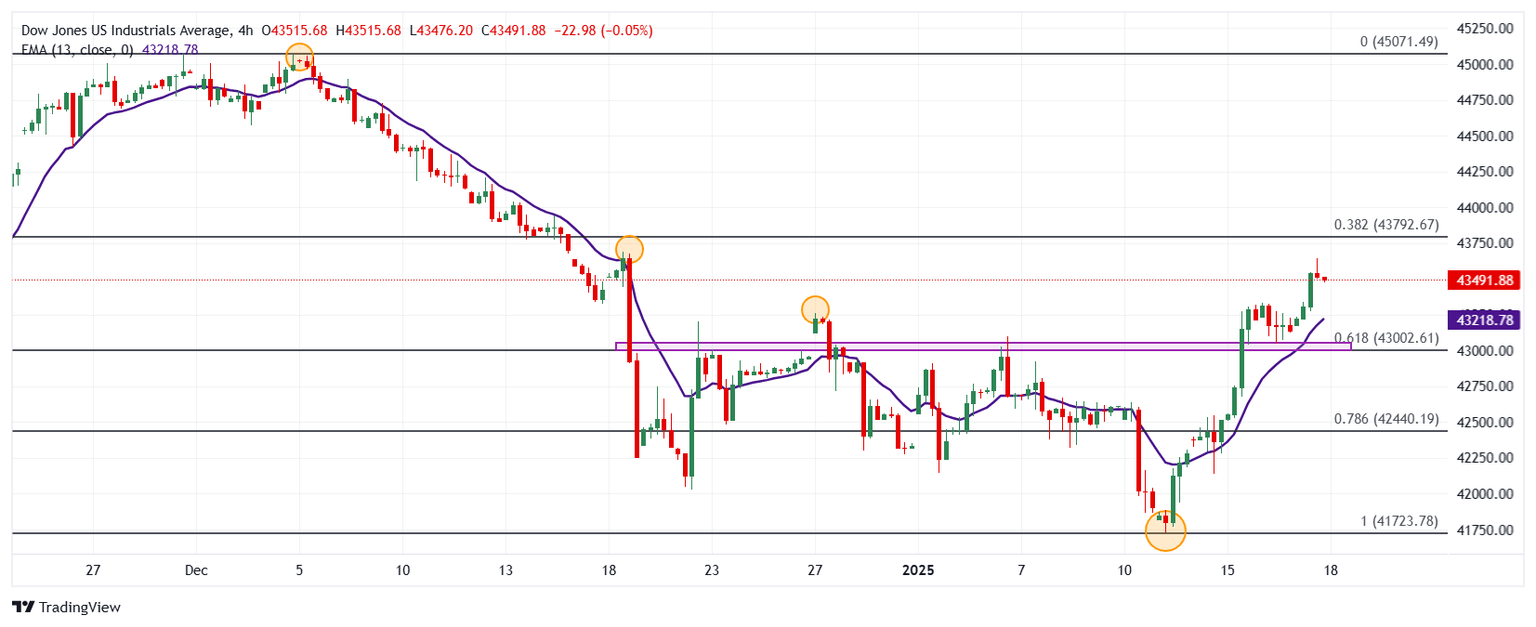El Dow Jones reaccionó al alza en un soporte de corto plazo dado por el mínimo del 13 de enero en 42.141. Al alza, la resistencia más cercana la observamos en 43.690, máximo del 18 de diciembre. La siguiente zona de resistencia importante se encuentra en 45.065, punto pivote del 4 de diciembre de 2024.