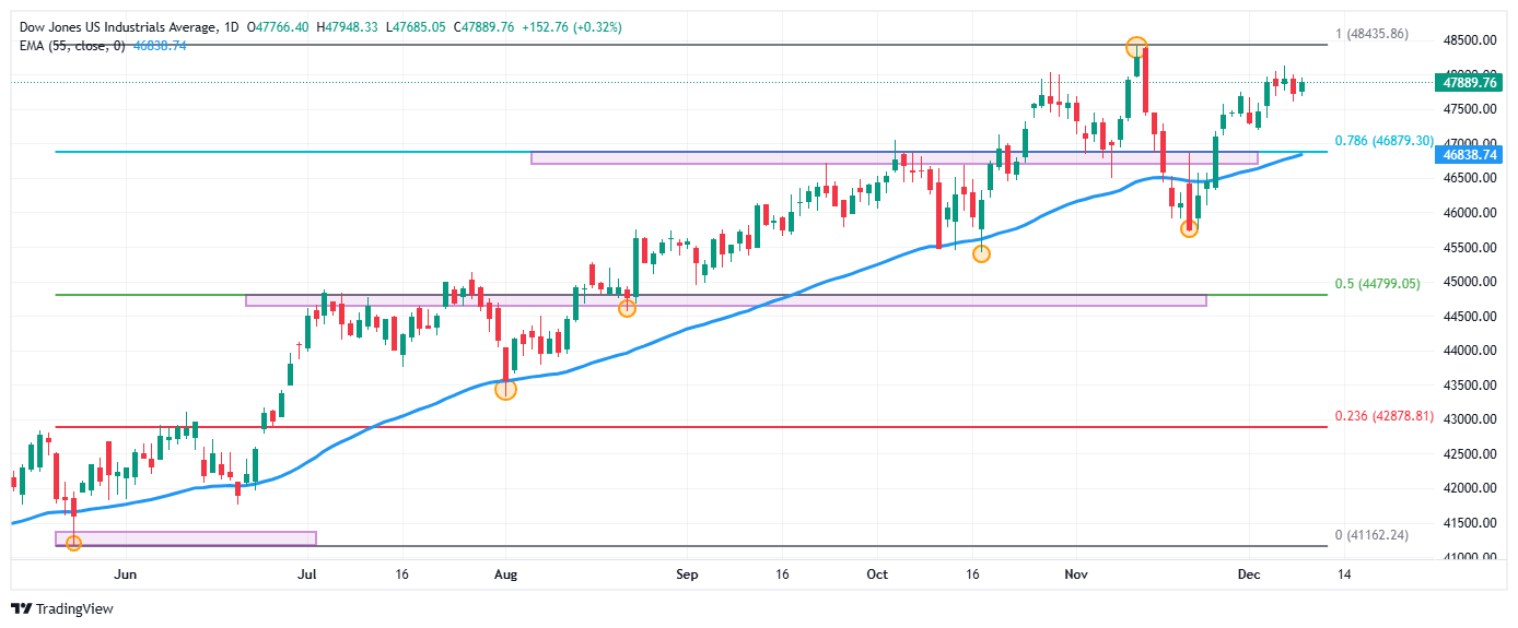 El índice Dow Jones sube un 0.19% en la jornada del martes, alcanzando un máximo diario en 47.948.