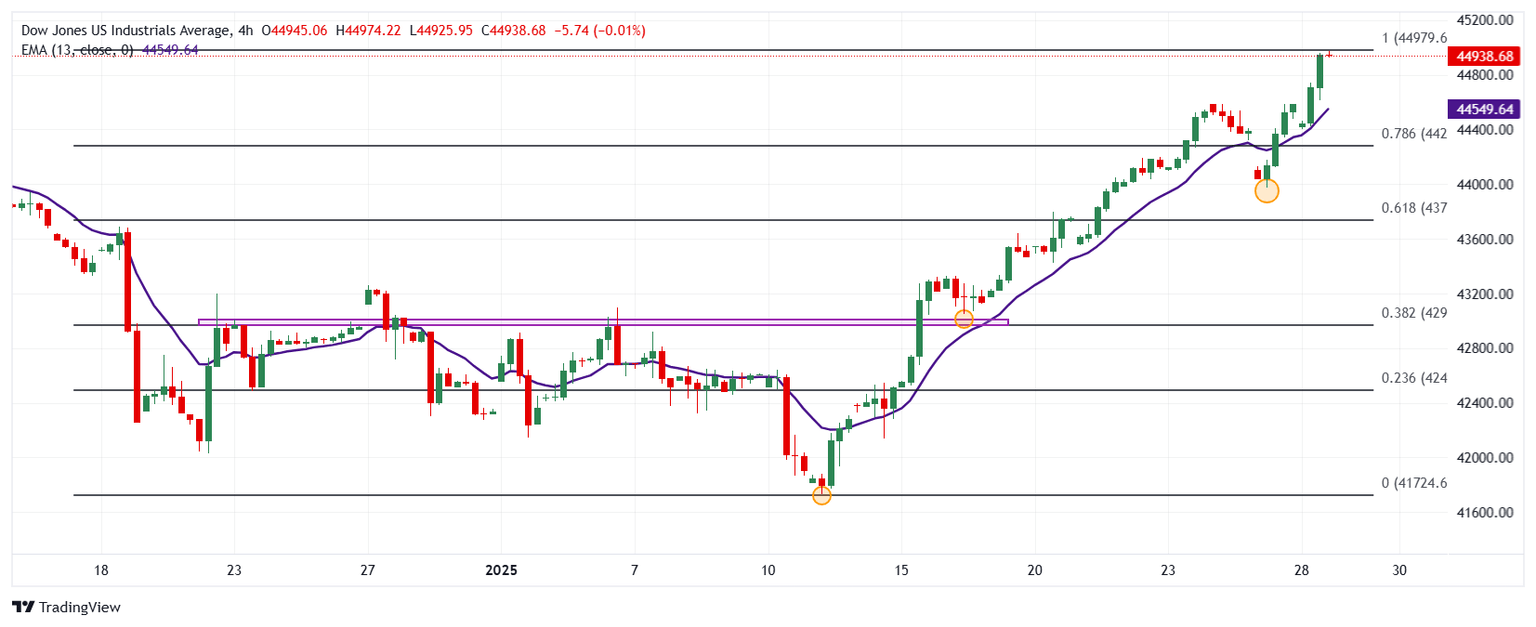 El índice Dow Jones firma su segunda jornada consecutiva con ganancias, repuntando un 0.65% el día de hoy, alcanzando máximos no vistos desde el 5 de diciembre de 2024 en 44.887.