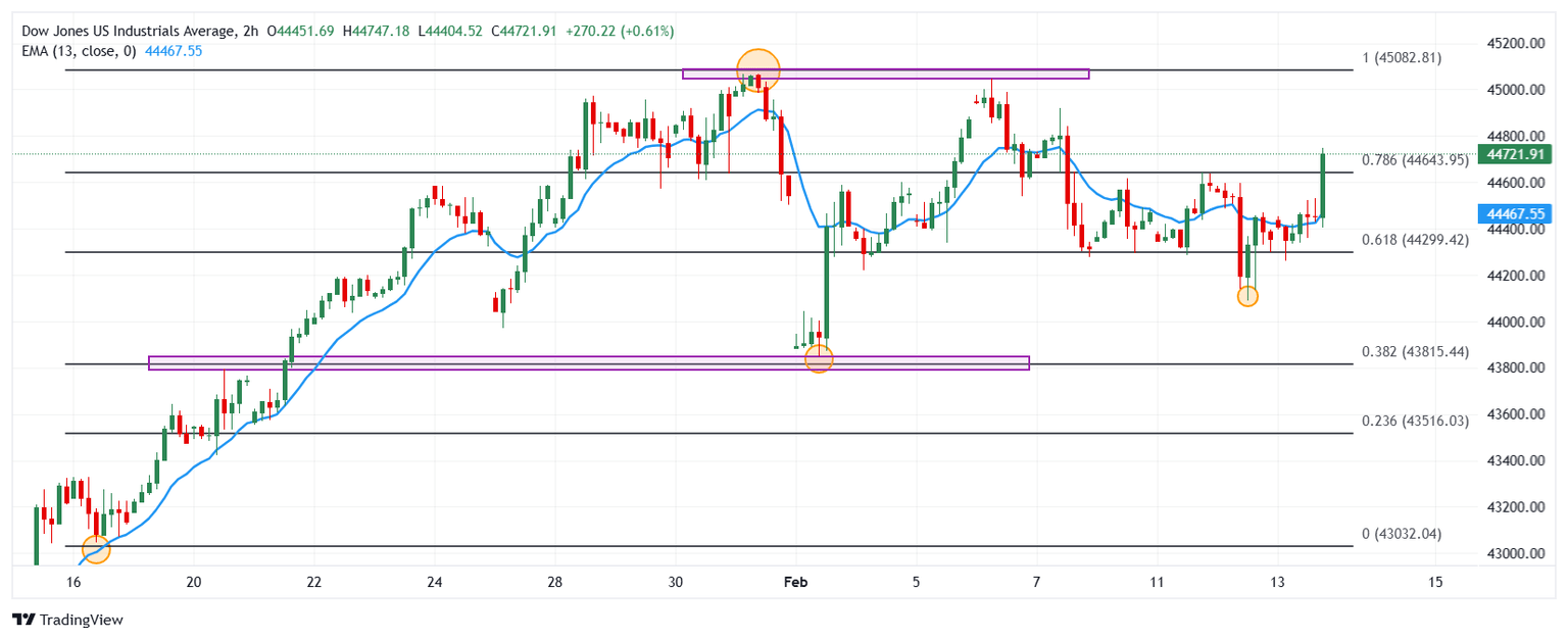 El índice Dow Jones gana un 0.75% diario, cotizando al momento de escribir sobre 44.698.