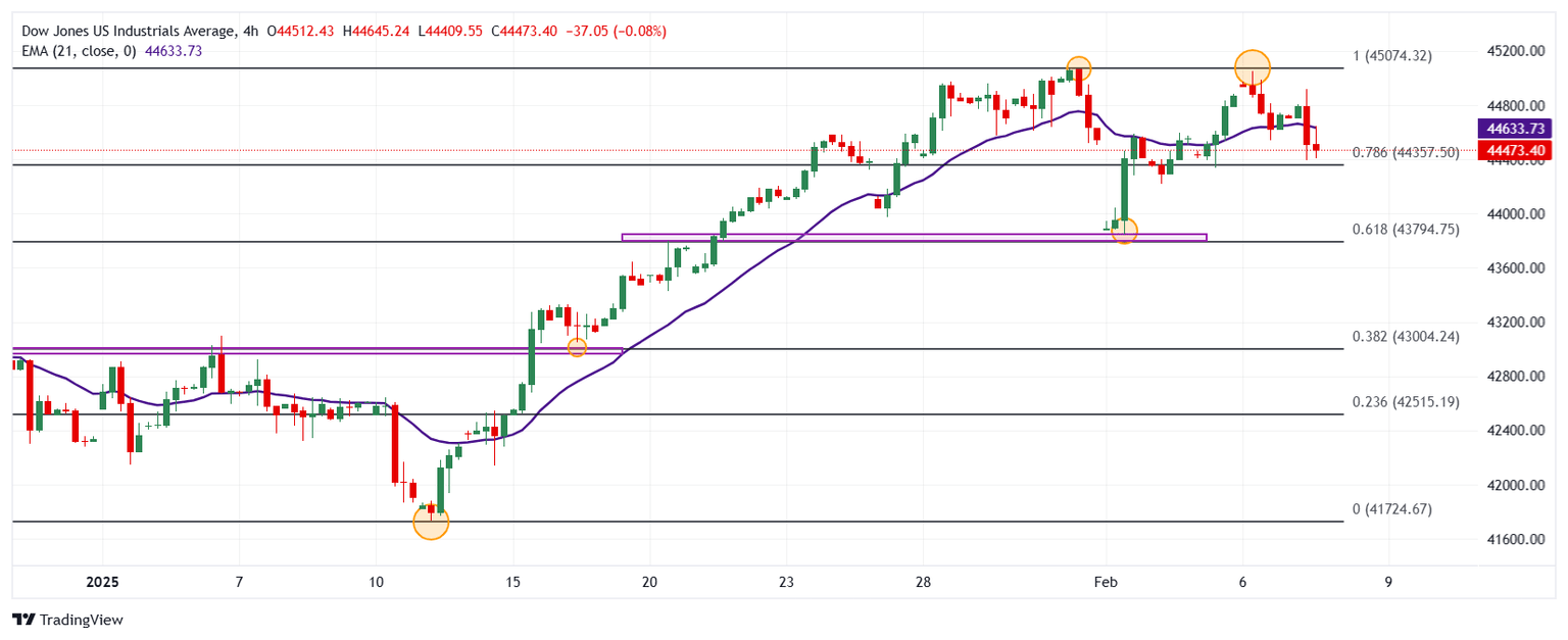 El Dow Jones estableció una resistencia de corto plazo dada por el máximo del 31 de enero en 45.066. El soporte más cercano está en 43.848, mínimo el 3 de febrero. La siguiente zona de soporte clave se encuentra en 43.048, punto pivote del 16 de enero.