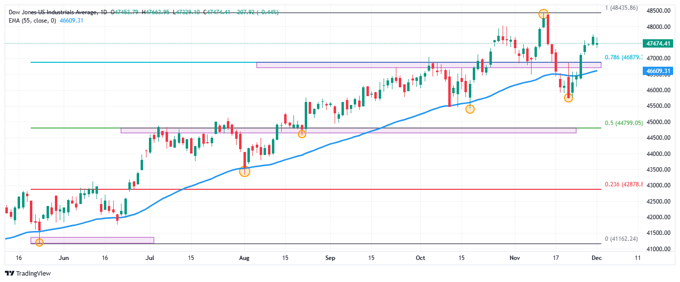 El Dow Jones marcó un máximo diario en 47.663, donde atrajo vendedores que arrastraron el índice a mínimos del 26 de noviembre en 47.329.