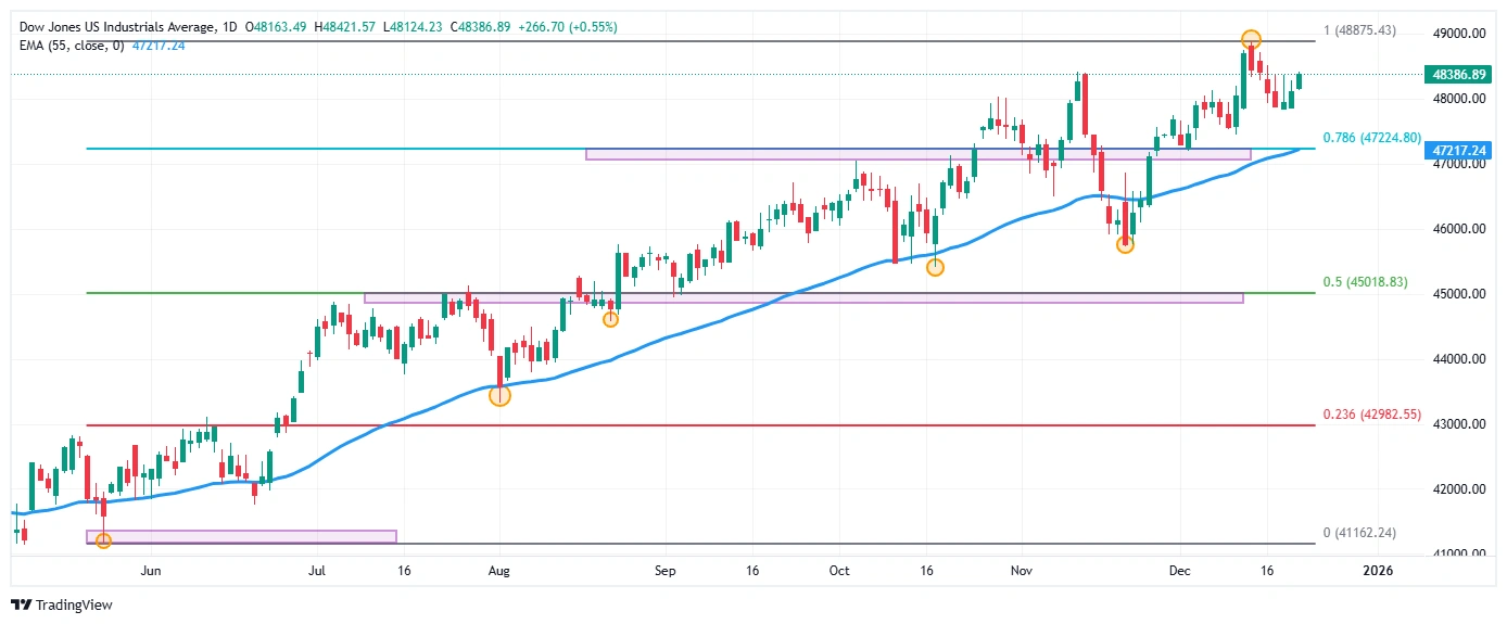 El Dow Jones marcó un mínimo diario en 48.124, encontrando compradores que impulsaron el índice a un máximo del día en 48.369.