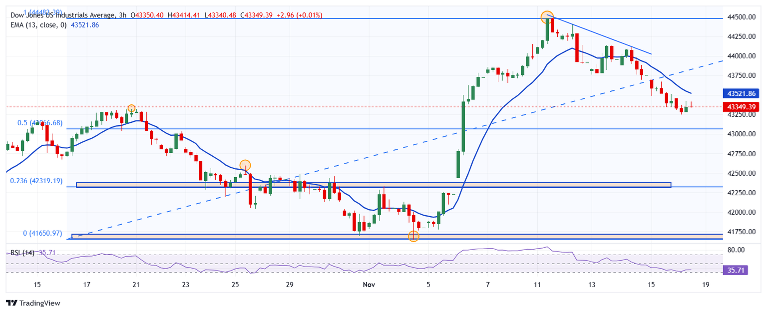 El Promedio Industrial Dow Jones presenta una caída de un 0.02% al iniciar la sesión del lunes, visitando mínimos del 6 de noviembre en 43.250.