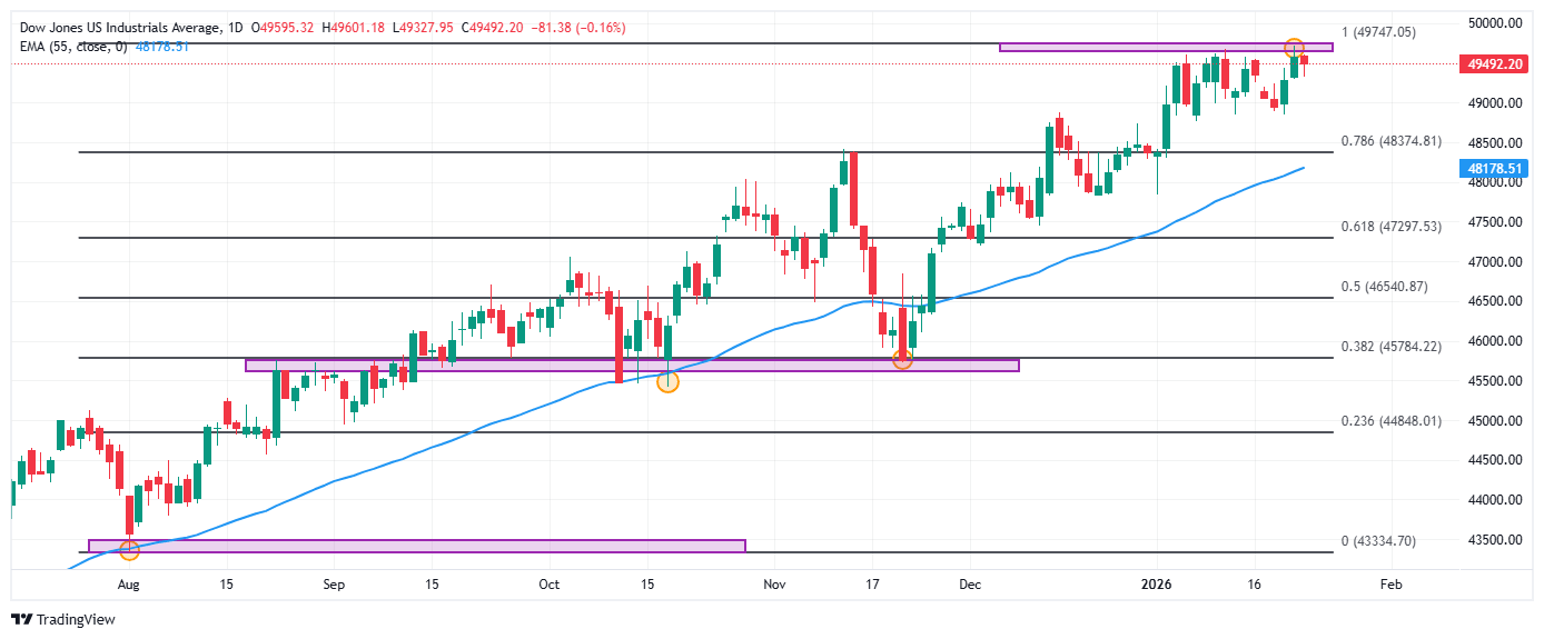 El Dow Jones marcó un máximo del día en 49.601, encontrando vendedores que arrastraron el índice a un mínimo diario en 49.327.