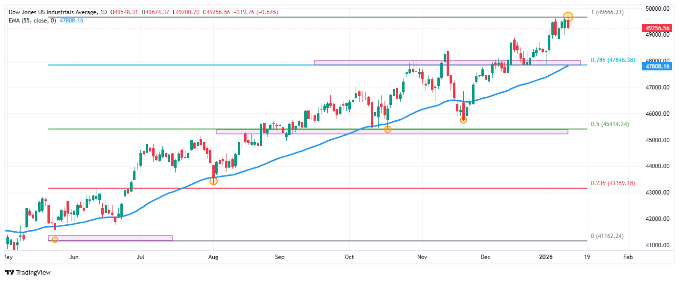 El índice Dow Jones retrocede un 0.55% diario, alcanzando un mínimo del día en 49.200.