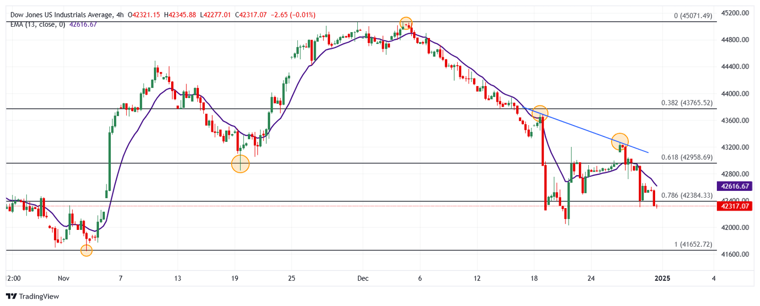 El Promedio Industrial Dow Jones cotiza al momento de escribir en 42.292, cayendo un 0.55% el día de hoy, extendiendo las pérdidas presentadas el día de ayer hasta llegar a mínimos del 20 de diciembre en 42.277.