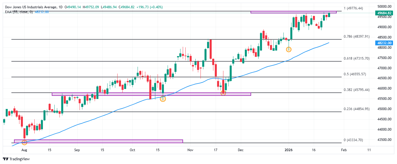 El Dow Jones registró un mínimo diario en 49.486, atrayendo compradores agresivos que impulsaron el índice nuevos máximos históricos en 49.752.