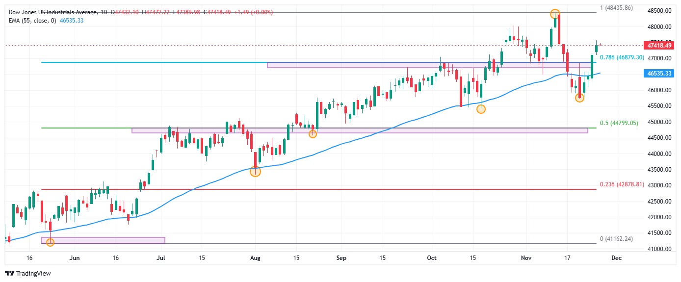 El Dow Jones estableció un mínimo del día en 47.389, encontrando compradores que llevaron el índice a un máximo del día en 47.472.