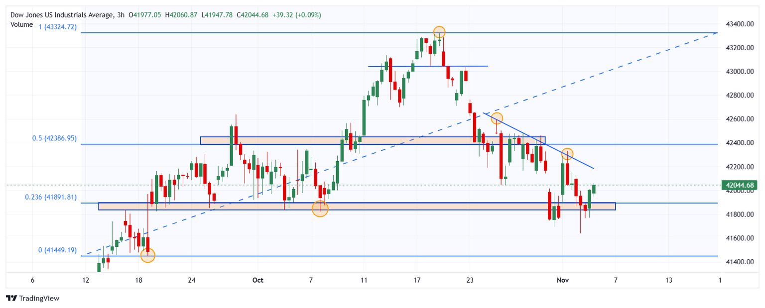 El Promedio Industrial Dow Jones estableció un soporte de corto plazo ubicado en 41.641, mínimo del 4 de noviembre. El siguiente nivel de soporte lo observamos en 41.447, punto pivote del 18 de septiembre.
