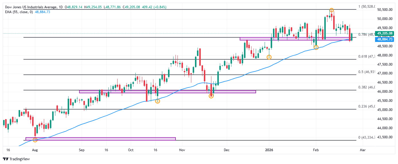 El Dow Jones repunta 413 puntos, operando actualmente sobre 49.210.