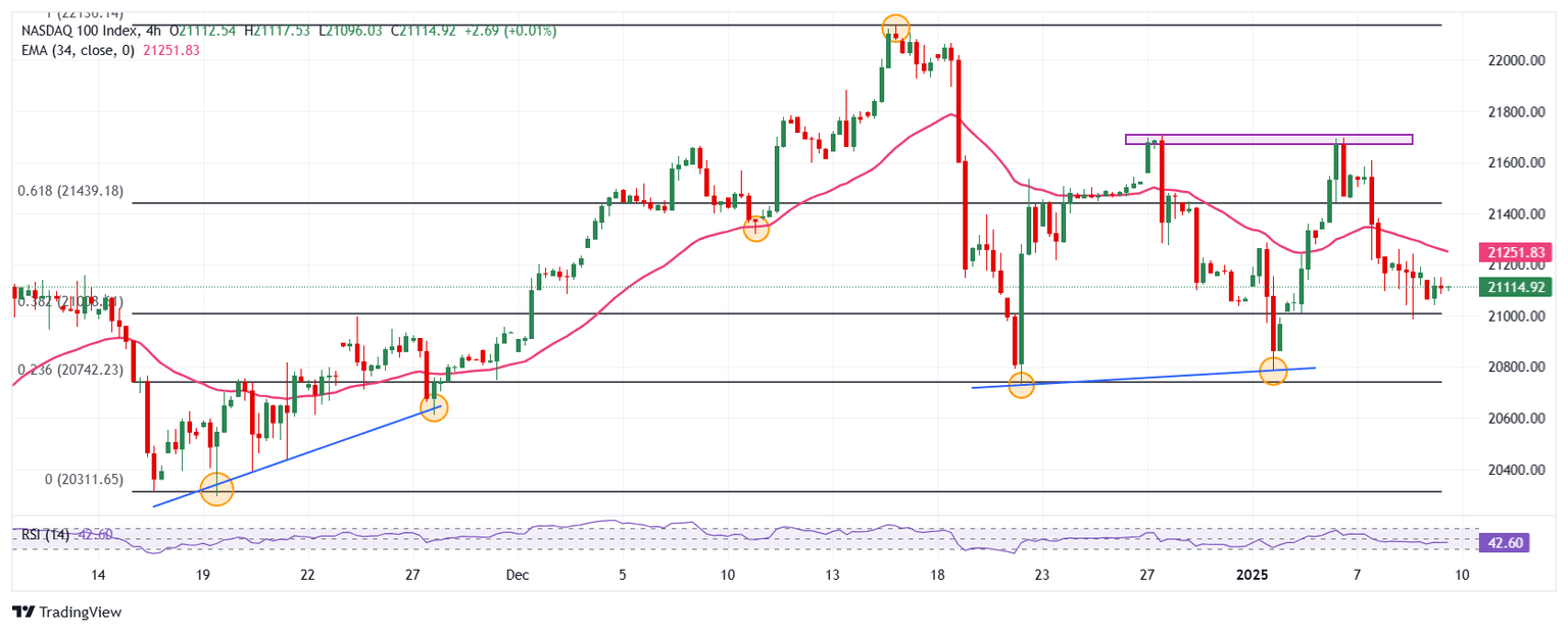 El Nasdaq 100 estableció una resistencia de corto plazo dada por el máximo del 6 de enero en 21.697. La zona de soporte más cercana está en 20.729, mínimo del 20 de diciembre de 2024 en confluencia con el retroceso al 23.6% de Fibonacci. La siguiente zona de soporte clave está en 20.293, punto pivote del 19 de noviembre de 2024.
