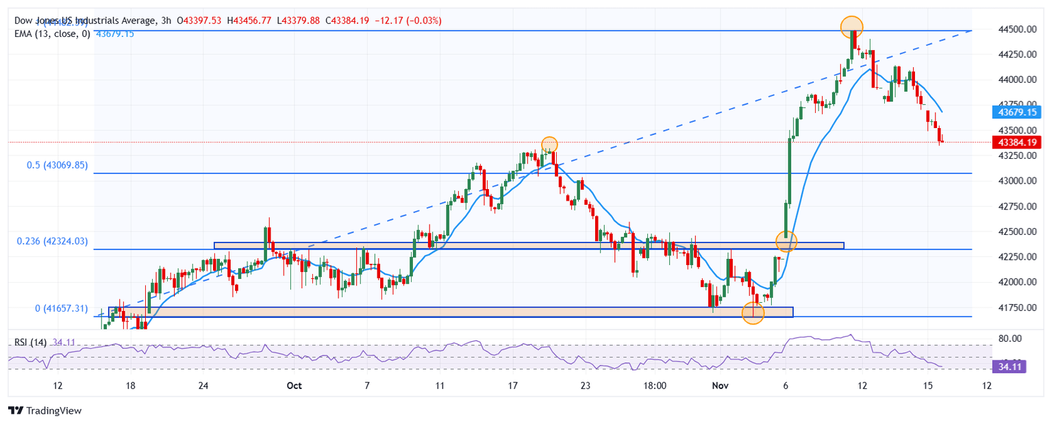 El Dow Jones cotiza a la baja posterior a la publicación de las ventas minoristas de EE.UU., correspondientes a octubre y a las declaraciones de Susan Collins, presidenta de la Reserva Federal de Boston, al señalar que un recorte de tasas en diciembre no está asegurado.
