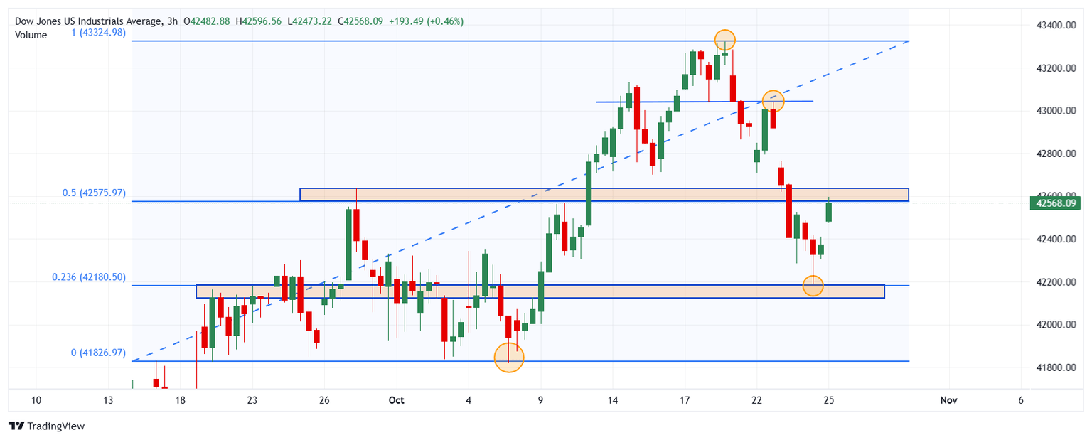 El Promedio Industrial Dow Jones reaccionó al alza en un soporte de corto plazo ubicado en 42187, dado por el mínimo del 24 de octubre. El siguiente nivel clave de soporte lo observamos en 41.821, punto pivote del 7 de octubre. La resistencia más cercana está en 43.036, máximo del 22 de octubre. La siguiente zona de resistencia importante se encuentra en 43.322, máximo histórico alcanzado el 18 de octubre.