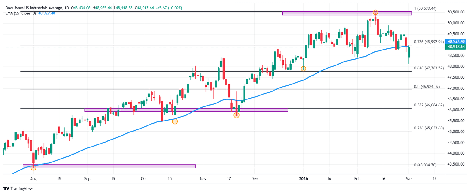 El Dow Jones cae un 0.08% diario, operando actualmente en 48.928.