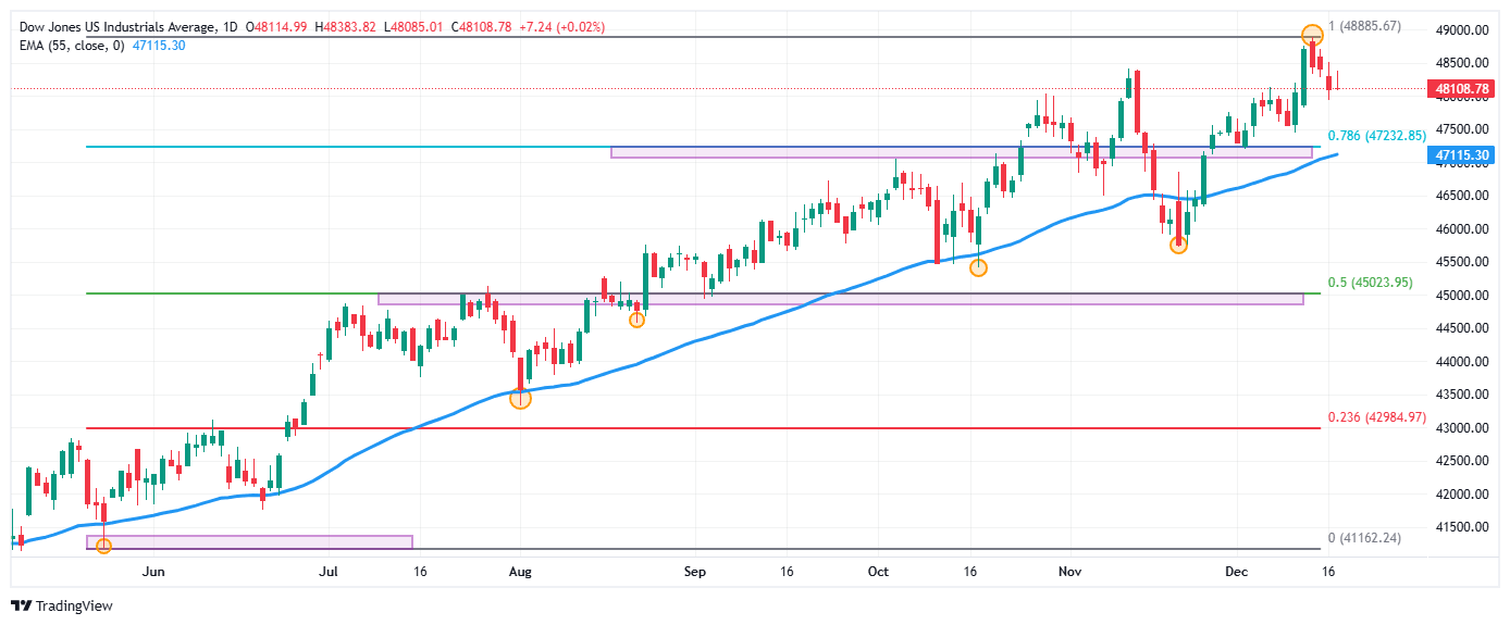 El Dow Jones estableció una resistencia de corto plazo dada por el máximo histórico alcanzado el 12 de diciembre en 48.878. A la baja, el soporte más cercano está en 45.729, mínimo del 20 de noviembre. El siguiente soporte importante se encuentra en 45.419, punto pivote del 17 de octubre, en sintonía con el promedio móvil exponencial de 55 periodos.