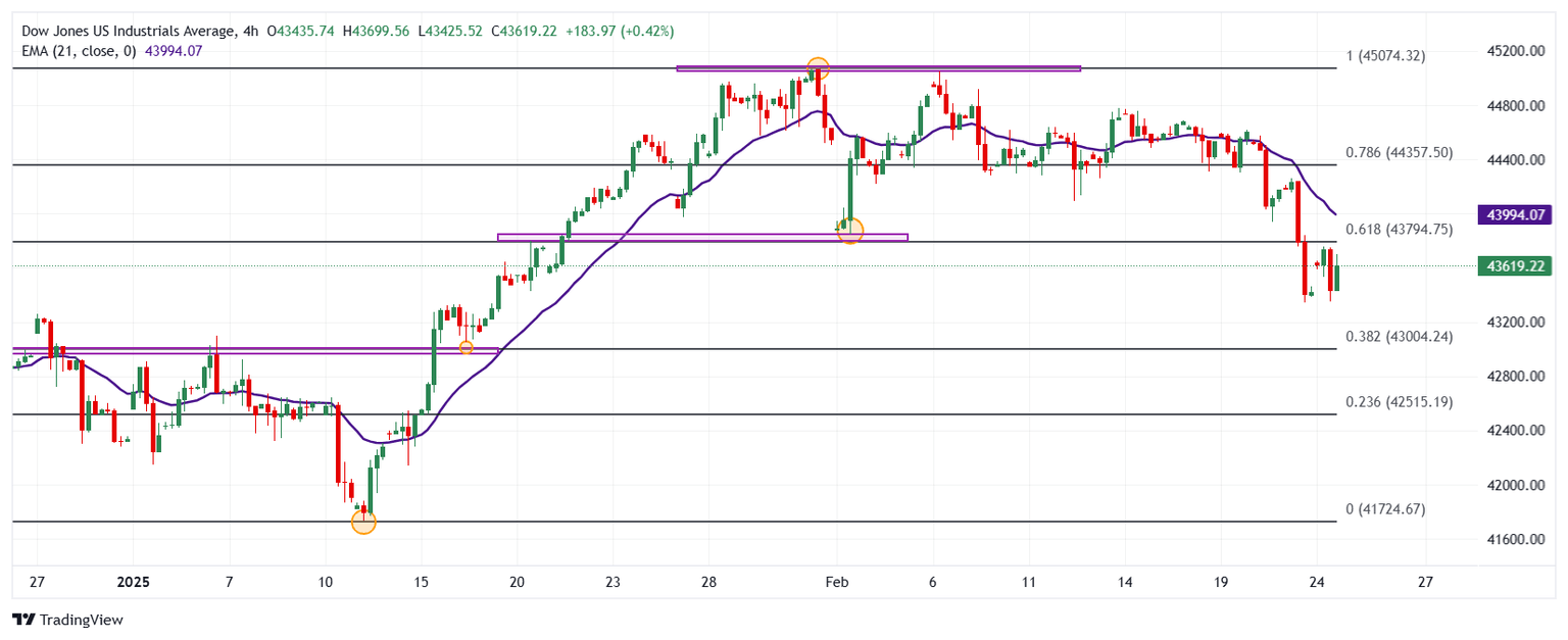El Dow Jones estableció un mínimo del día en 43.350, donde atrajo compradores que impulsaron el índice a un máximo diario en 43.754.