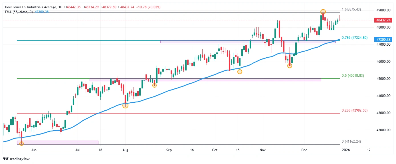 El índice Dow Jones gana un 0.09%, marcando un máximo del día en 48.734.