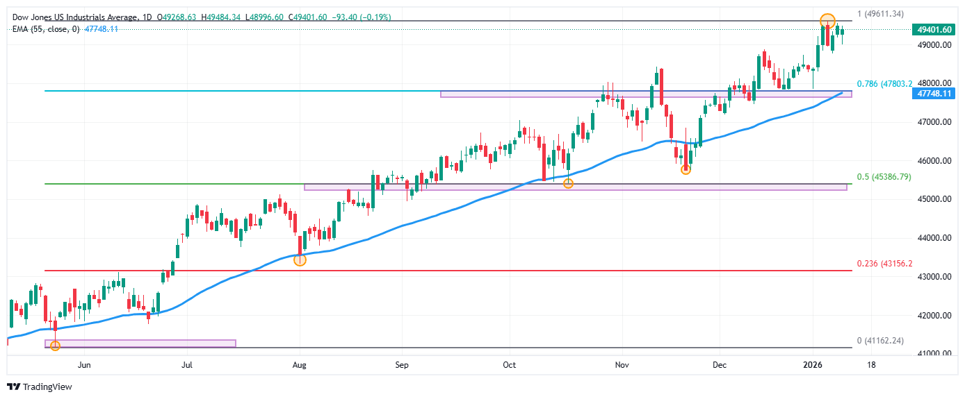 El Dow Jones rebotó desde mínimos del 8 de enero en 48.996, atrayendo compradores que llevaron el índice a un máximo del día en 49.415.