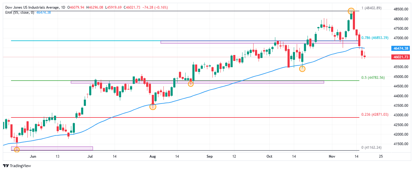 El Dow Jones registró un máximo diario en 46.296, donde atrajo vendedores agresivos que arrastraron el índice a un mínimo del día en 45.986.